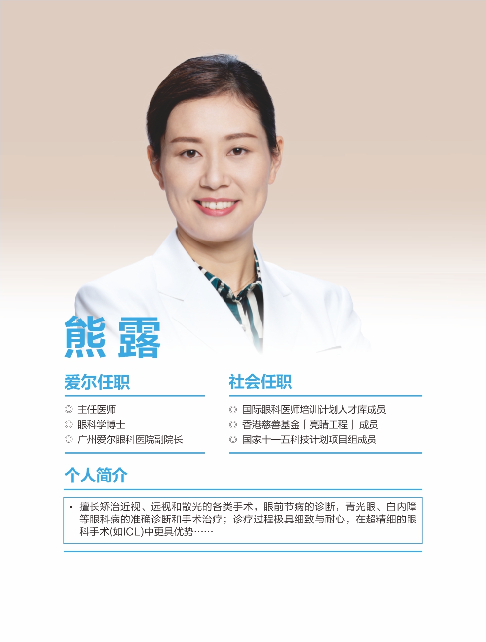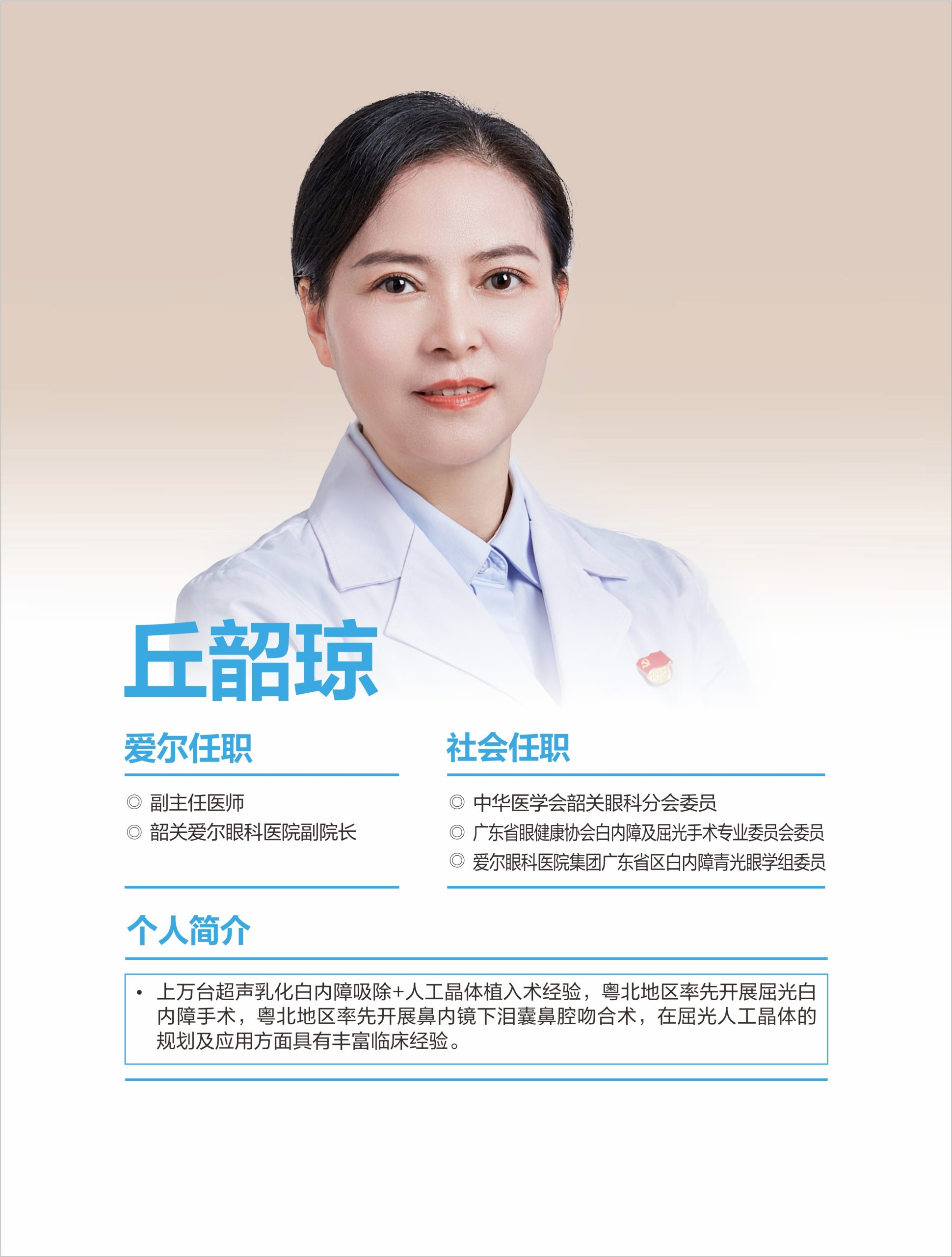 韶關(guān)愛爾眼科醫(yī)院有限公司白內(nèi)障團隊擁王愛琴院長(愛爾眼科粵北區(qū))、丘韶瓊院長、郭俊豪主任等多位專科醫(yī)生,具備同步國際的白內(nèi)障手術(shù)能力,能熟練開展各項常規(guī)及疑難白內(nèi)障手術(shù)。 可開展微切口煥晶白內(nèi)障手術(shù),植入多焦晶體或多焦+散光矯正晶體,在治療白內(nèi)障同時同步解決遠視/近視、老花眼、角膜散光等屈光問題,醫(yī)生手術(shù)經(jīng)驗豐富,為眾多患者帶來更舒適的視覺。